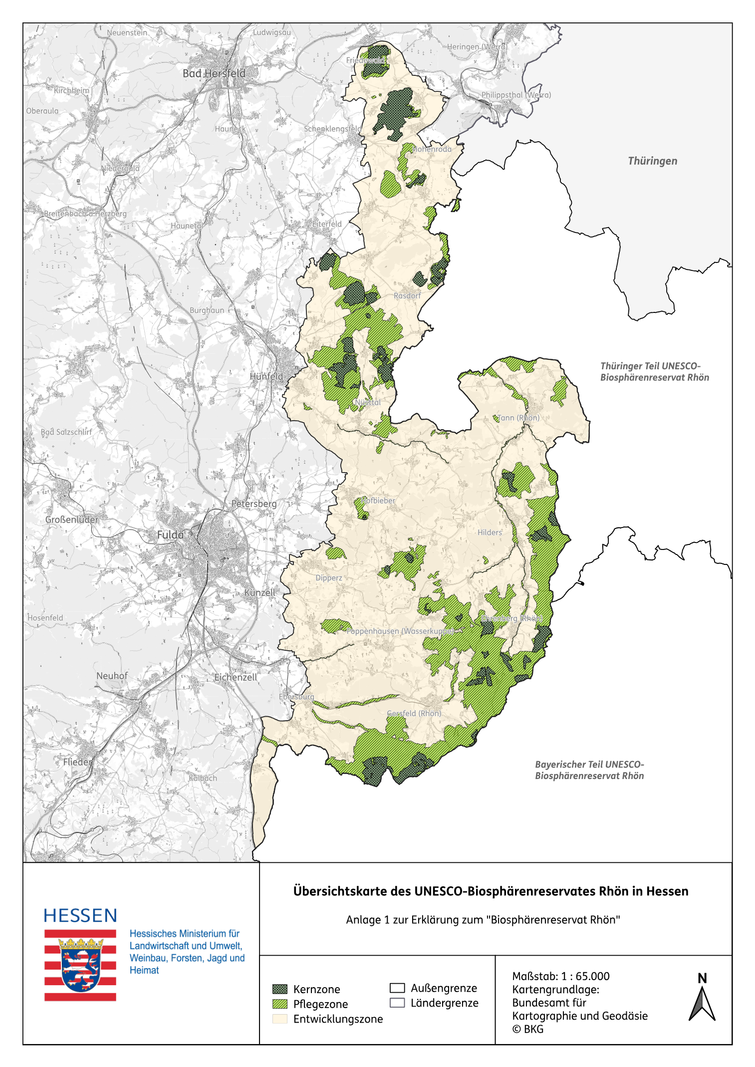 Das Biosphärenreservat Rhön umfasst eine Fläche von rund 185.000 ha. Diese Fläche verteilt sich auf die drei Länder Bayern (rund 73.000 ha), Hessen (rund 63.500 ha) und Thüringen (rund 48.500). Der hessische Teil des Biosphärenreservates Rhön liegt vollständig im Regierungsbezirk Kassel und umfasst Teile der Landkreise Fulda und Hersfeld-Rotenburg, wobei der überwiegende Teil der hessichen Fläche im Landkreis Fulda liegt.